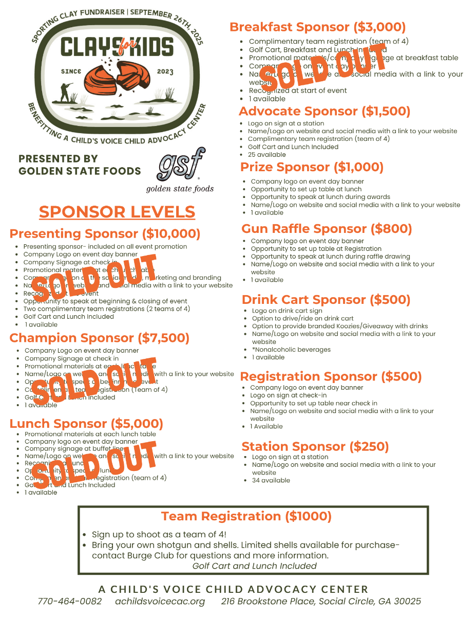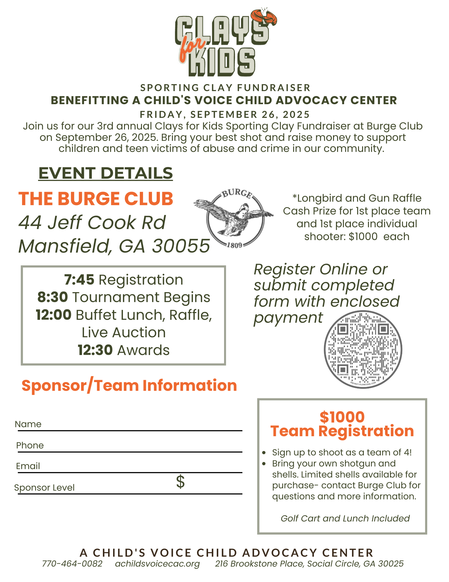 Join us for the third annual Clays for Kids Sporting Clay Fundraiser at Burge Club, benefitting A Child’s Voice Child Advocacy Center!