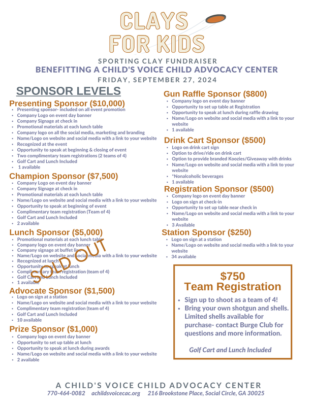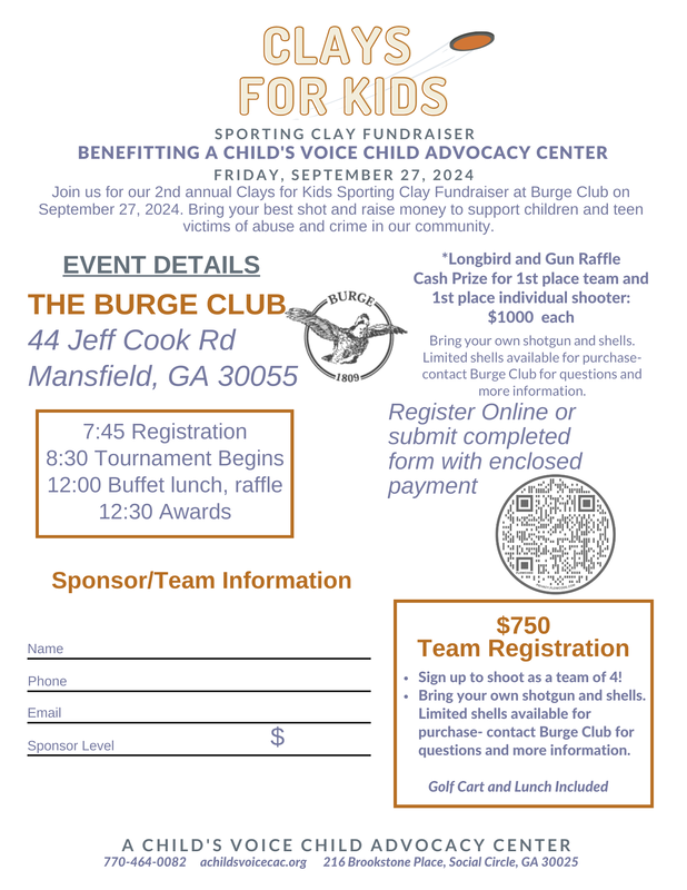 ¡Únase a nosotros para la segunda recaudación de fondos anual de Clays for Kids Sporting Clay en Burge Club, en beneficio de A Child's Voice Child Advocacy Center!
